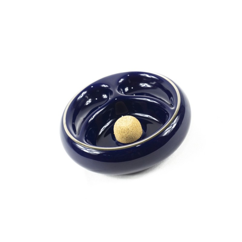 Posacenere battipipa tondo in ceramica blu con profilo argentato, completo di 2 poggiapipa.