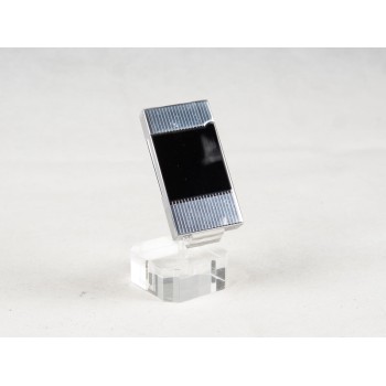 Wellington è un raffinato accendino dal design moderno, con fiamma classica e accensione a pietrina. Questa versione è laccata nera con finiture cromate a linee verticali incise.