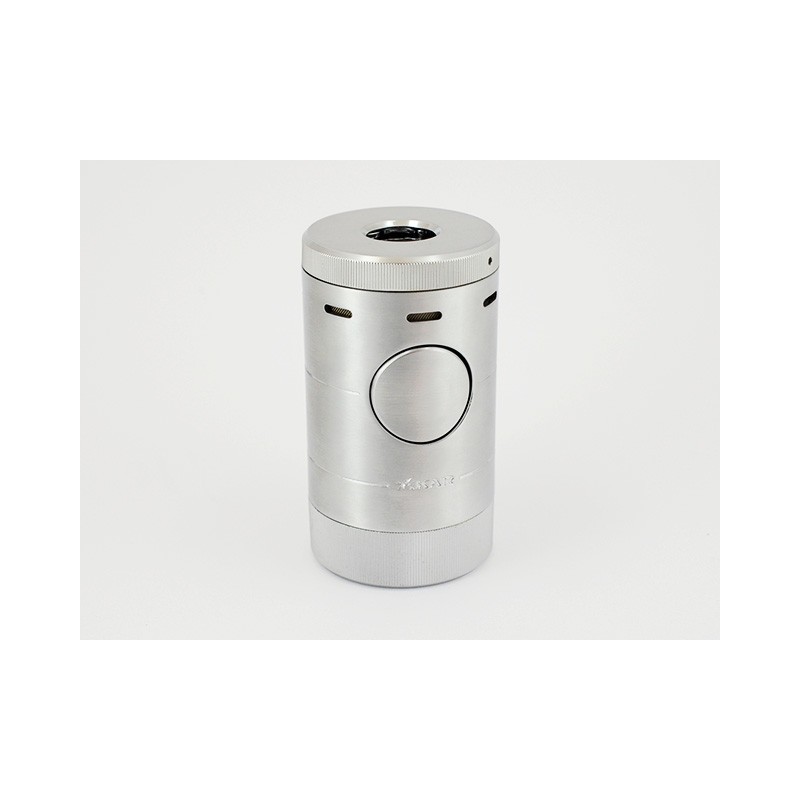 Avveniristico accendisigari da tavolo di forma cIlindrica, dotato di un super pulsante e di un coperchio superiore a protezione dei quattro bruciatori, la cui apertura si ispira ad una fotocamera high-tech. Questa versione presenta una finitura color argento.