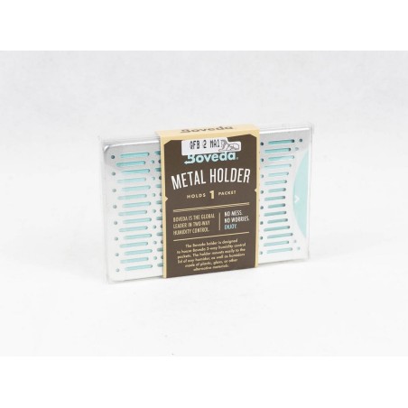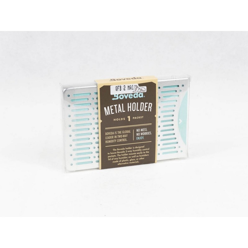 La confezione è composta da un contenitore in metallo per 1 Boveda e un kit di montaggio magnetico o con velcro per applicarlo facilmente al coperchio di humidor realizzati in qualunque materiale.