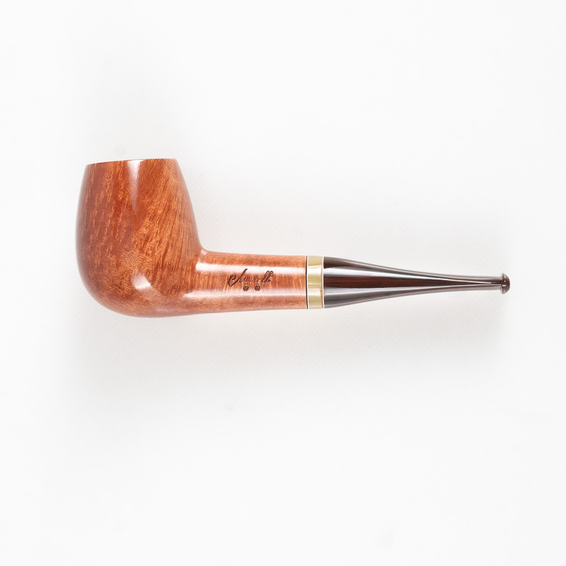 Il siciliano Salvatore Amorelli inizia a realizzare pipe nel 1982 e da subito la sua forza sta nella scelta della materia prima: la radica di Sicilia, rinomata per leggerezza e porosità, e la radica calabrese, che nel tempo ha in larga parte sostituito quella siciliana per la scarsità di tagliatori sull’isola. Gli abbozzi vengono stagionati in Sicilia all’aria aperta per 5 lunghi anni, per essere poi lavorati da Salvatore e dai suoi collaboratori nel piccolo laboratorio di Caltanissetta. Amorelli produce sei serie, distinte per forma e non per qualità: Busbee (il cui bocchino presenta un prestigioso intarsio in radica a forma di U, curvato a mano con l’ausilio dell’acqua e del fuoco), Frac, Nail, Ghibli, Lyra e Fish Tail. Il segno distintivo delle pipe Amorelli è costituito dalla barretta d’oro 18 carati applicata sul cannello e sul bocchino, allineata perfettamente per unire i due elementi. La categoria di pipe prodotte solo con superficie liscia, in tonalità chiara e prive di mastice, è contraddistinta da stelle. Per documentare la perfezione del legno anche all’interno del fornello, Amorelli rinuncia alla pennellatura di polvere di carbone. La meticolosità nella selezione dei materiali, l’altissimo livello nella lavorazione artigianale e l’attenzione per i dettagli fanno di Amorelli uno dei marchi più apprezzati da fumatori e collezionisti.