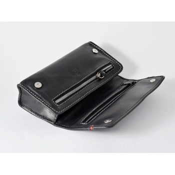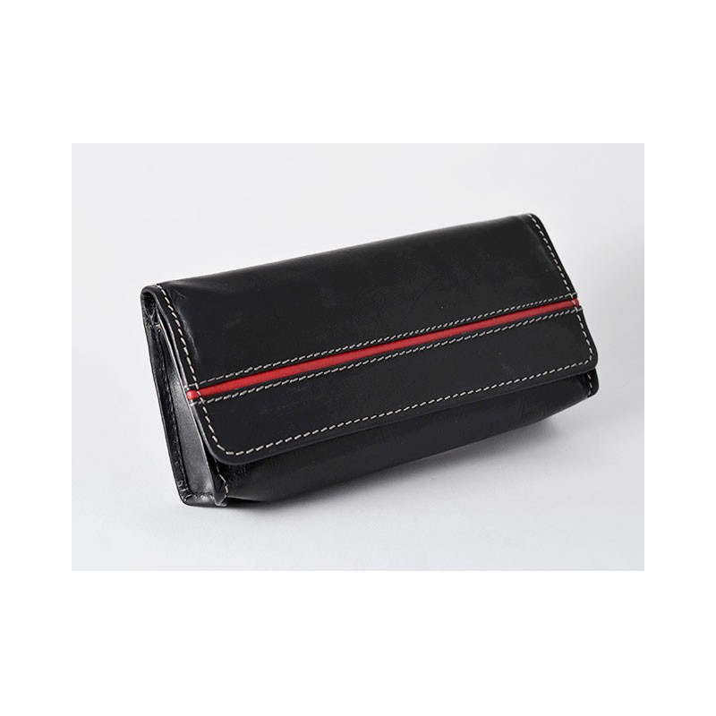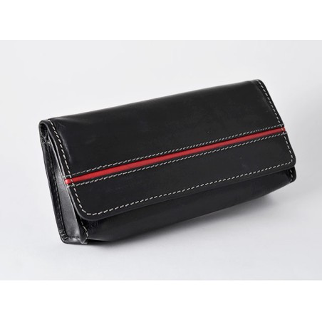 Astuccio per 1 pipa in pelle nera con profilo rosso, completo di buste portatabacco per 2 miscele. Chiusura a calamita.