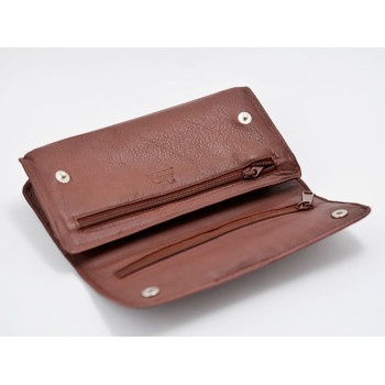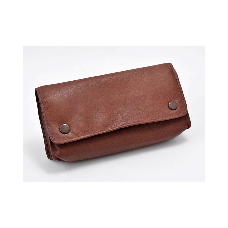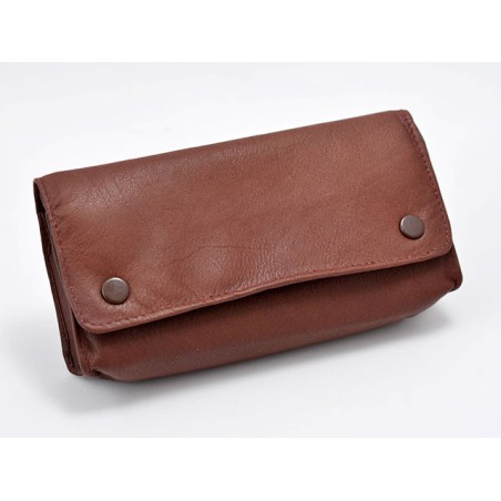 Astuccio per 1 pipa in nappa color cognac, completo di buste portatabacco per 2 miscele e tasca porta-accessori. Chiusura a 2 bottoni.