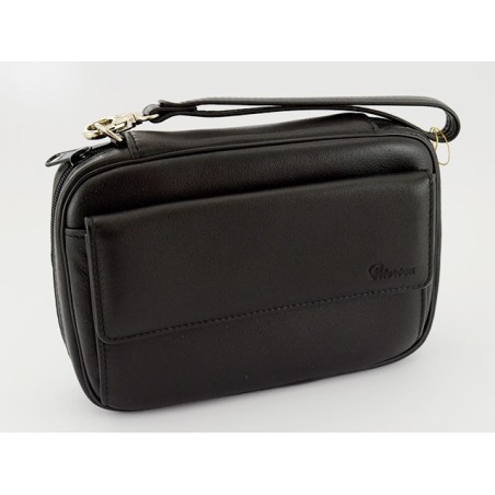 Trousse per 4 pipe in pelle di vitello nera, completa di busta portatabacco e porta-accessori. Chiusura a zip.