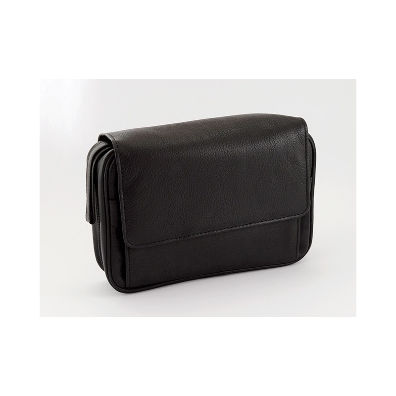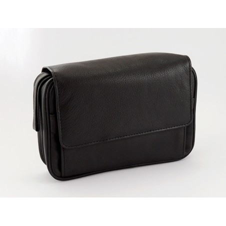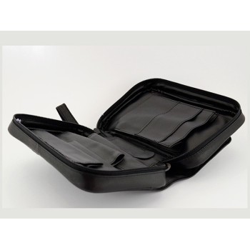 Trousse per 4 pipe in nappa nera con patta, completa di busta portatabacco e porta-accessori. Chiusura a zip.