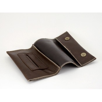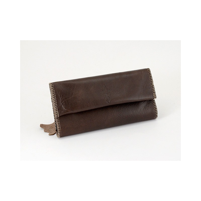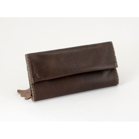 Busta portatabacco avvolgibile in cuoio grezzo marrone con patta, completa di portacartine. Chiusura a doppia calamita. Comoda tasca portafiltri con chiusura a zip sul retro.