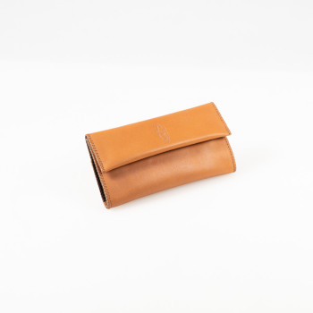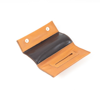 Busta portatabacco avvolgibile in cuoio grezzo color tabacco con patta, completa di portacartine. Chiusura a doppia calamita. Comoda tasca portafiltri con chiusura a zip sul retro.