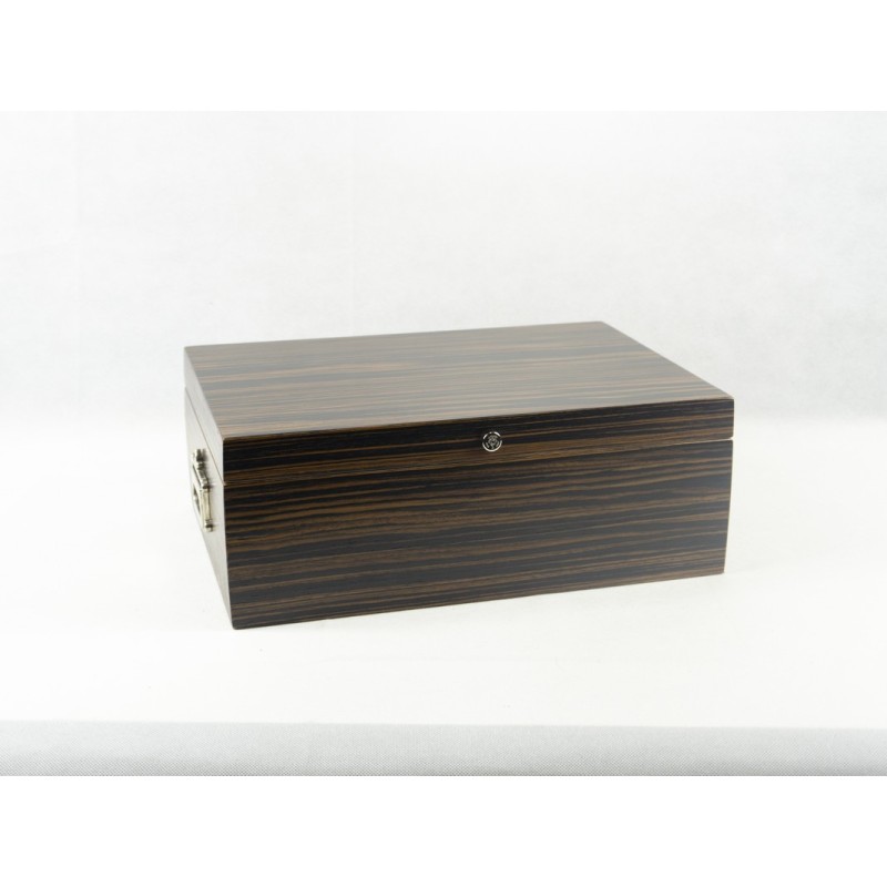 Humidor da 100 sigari in legno dotato di maniglie, con finitura makassar e interno in mogano. Umidificatore e igrometro inclusi.