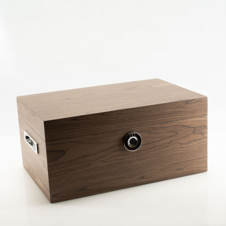 Humidor per 100 sigari in pregiato legno massello, con interno in legno massello di cedro. I fori di aerazione del vassoio, che garantiscono l’umidità ottimale, sono a forma di quadrilobi, decorazione tipica dell’architettura veneziana. Igrometro digitale incluso e sistema di umidificazione a polimeri acrilici. Apertura elettronica a impronta digitale.