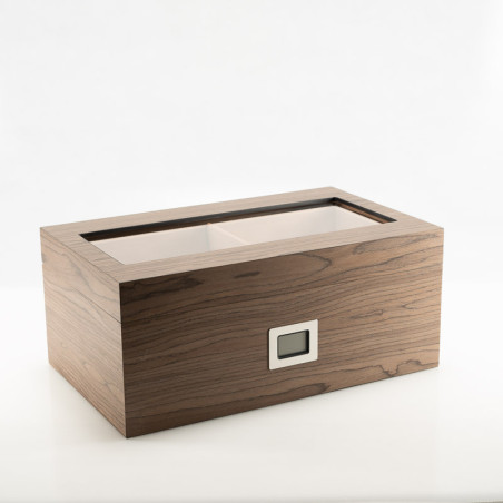 Humidor per 100 sigari in pregiato legno massello, con interno in legno massello di cedro. I fori di aerazione del vassoio, che garantiscono l’umidità ottimale, sono a forma di quadrilobi, decorazione tipica dell’architettura veneziana. Coperchio in legno e vetro. Igrometro digitale esterno e sistema di umidificazione a polimeri acrilici.