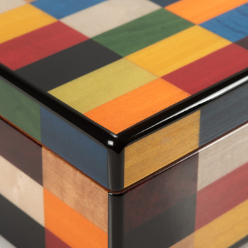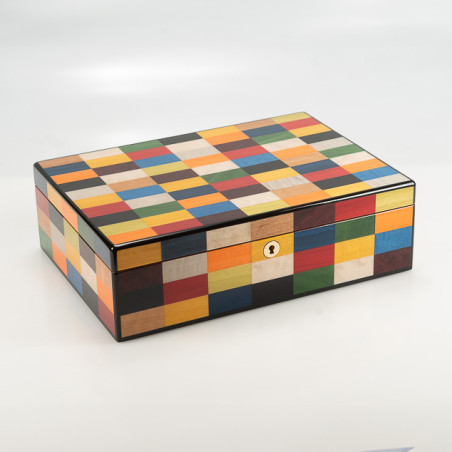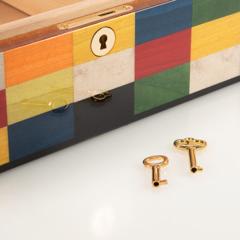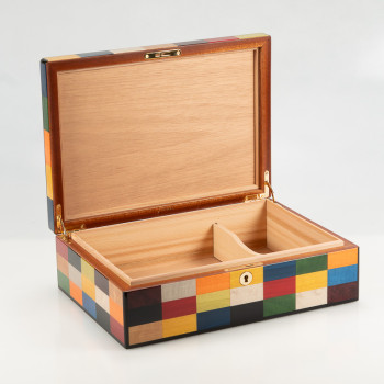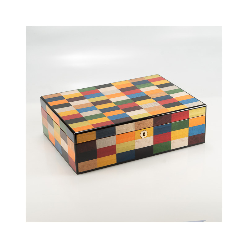 Elegante e raffinata, questa scatola portasigari della Collezione Venezia è ideale per contenere 40-50 sigari ed è un versatile oggetto d’arte che completerà superbamente qualsiasi stile di arredamento. Realizzata artigianalmente in mogano e impiallacciata a mano, è modellata in legno di cedro e presenta uno splendido intarsio di rettangoli colorati arlecchino. Finitura lucida e parti in metallo galvanizzato color oro. Dotato di serratura.