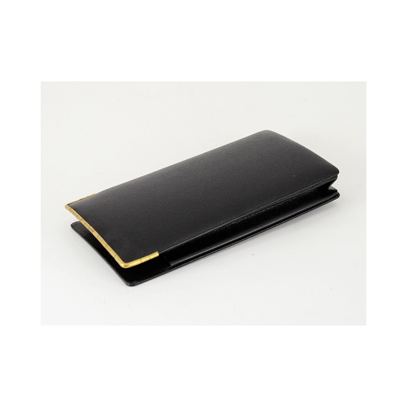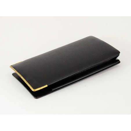 Portasigari da tasca aperto per 4 sigari formato “Corona”. Lavorazione in pelle nera con profilo superiore dorato.