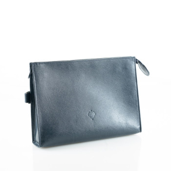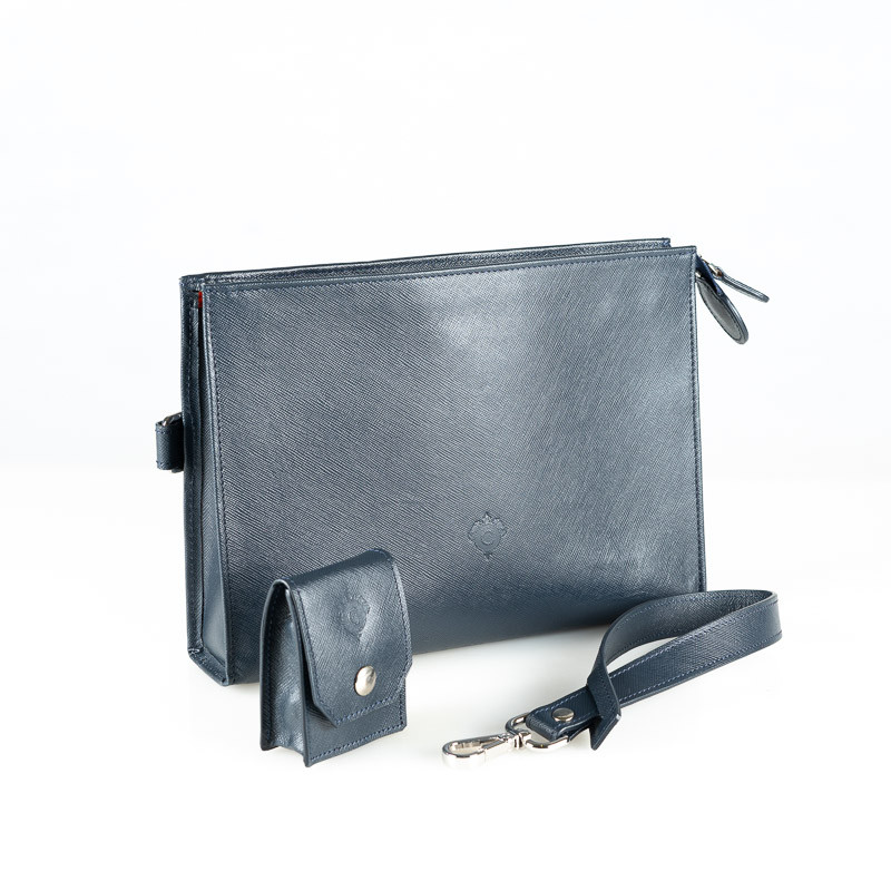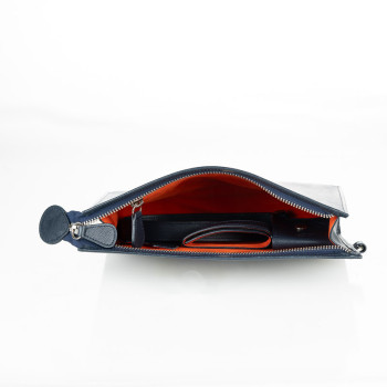 Elegante pochette portasigari, completa di porta-accessori estraibile, tasche interne e cinturino da polso staccabile. Esterno in vitello blue navy saffiano e interno scamosciato arancione. Prodotto realizzato con pellami di primissima qualità, seguendo tecniche tradizionali di lavorazione a mano. Il trattamento dei materiali è ottenuto con prodotti naturali, nel pieno rispetto dell’ambiente, che garantiscono nel tempo bellezza e fascino.