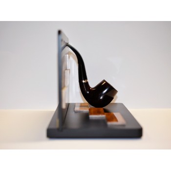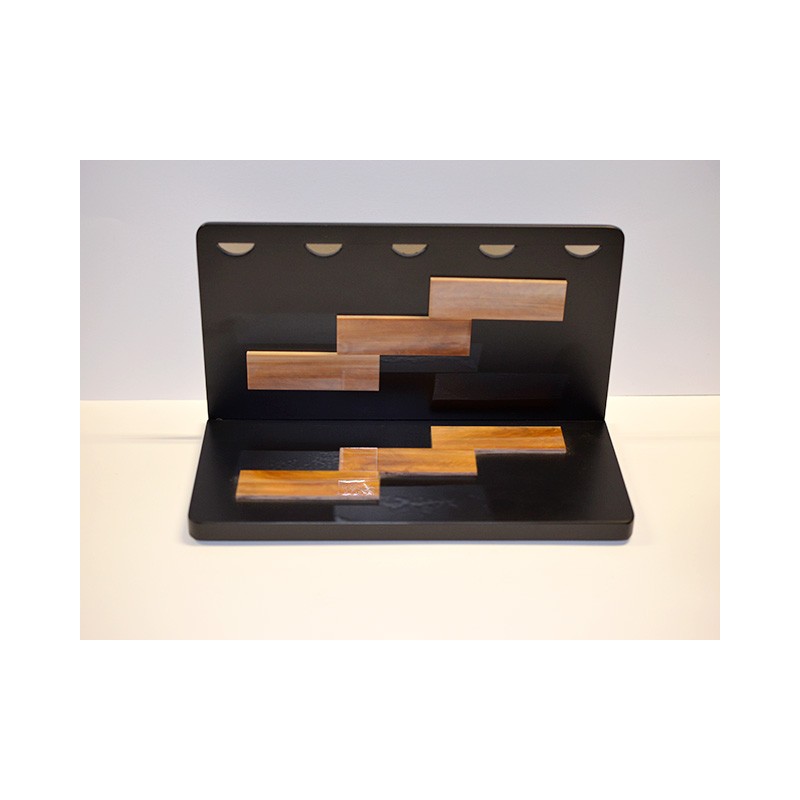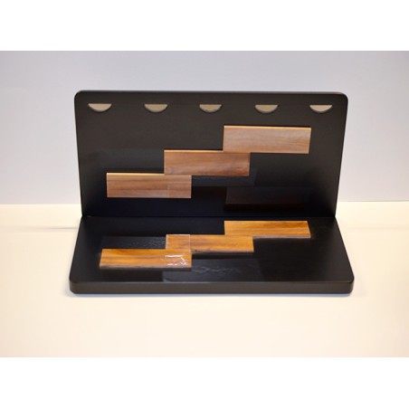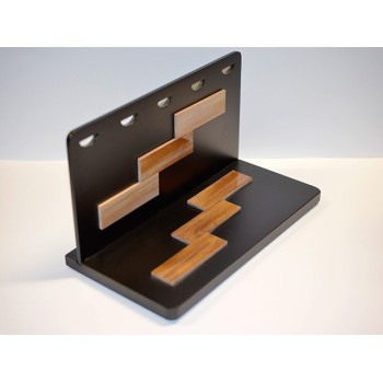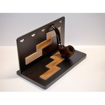 Originale poggiapipe a 5 posti in legno nero con tasselli in legno naturale per l'alloggio delle pipe. Posizione delle pipe: verticale.