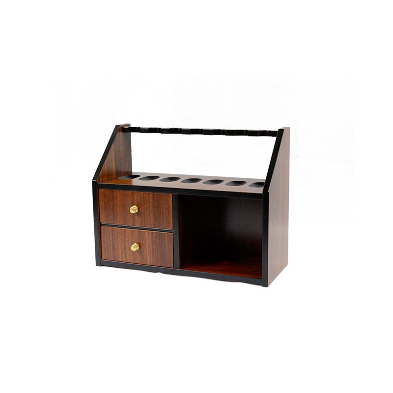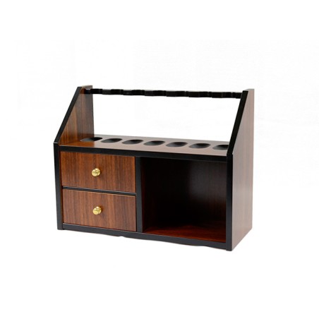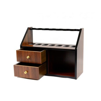Poggiapipe/rastrelliera a 7 posti in noce. Due comodi cassetti con pomelli dorati e una nicchia nella parte inferiore. Posizione delle pipe: verticale.