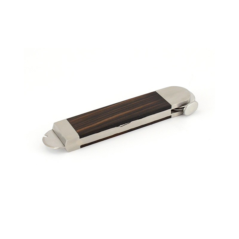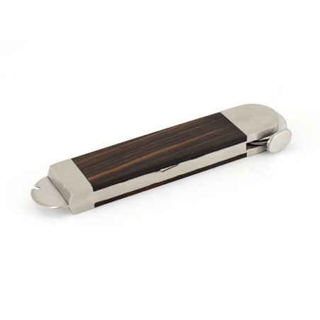 Tagliasigari da tavolo a ghigliottina in acciaio inox con rivestimento in legno venato. Apertura a pressione. Completo di leva e di martelletto per l'apertura e la chiusura delle scatole di sigari.