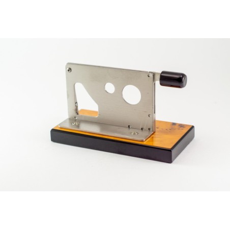 Tagliasigari da tavolo a ghigliottina, azionabile mediante pressione sulla leva. Doppio diametro di taglio e sicura. Lame in acciaio inox e base in legno chiaro.
