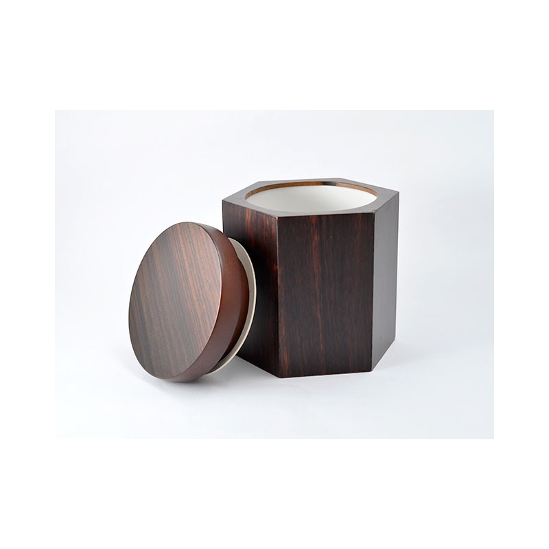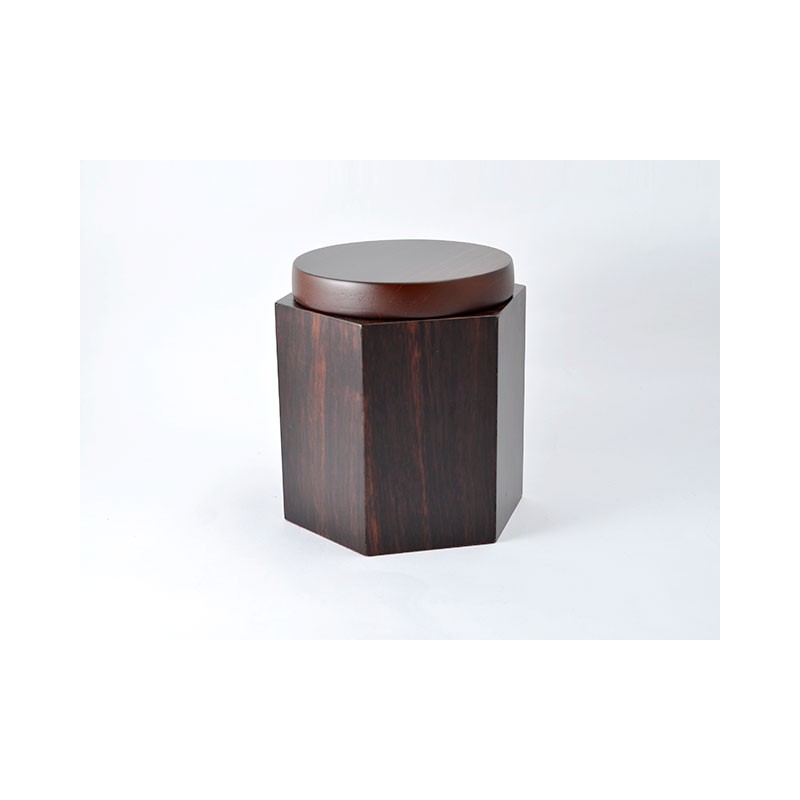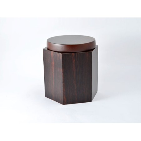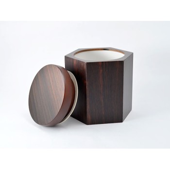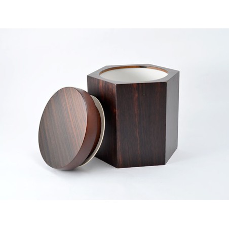 Vaso portatabacco a sezione esagonale e coperchio a sezione circolare realizzato con diverse radiche scure. Umidificatore incluso.
