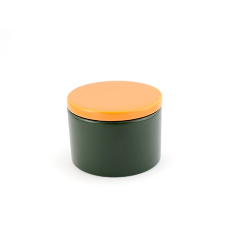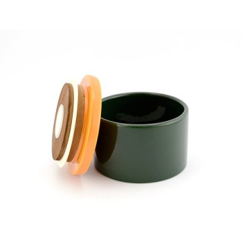 Vaso portatabacco in ceramica verde opaco con coperchio ocra lucido. Capacità 100 g. Umidificatore incluso.