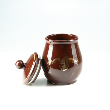 Vaso portatabacco bombato in ceramica testa di moro, con decorazione Sherlock Holmes.