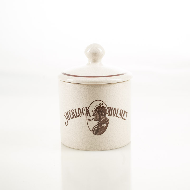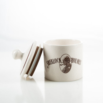 Vaso portatabacco cilindrico in ceramica bianca effetto craquelé, con decorazione Sherlock Holmes marrone.