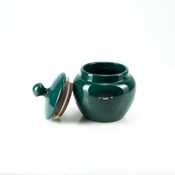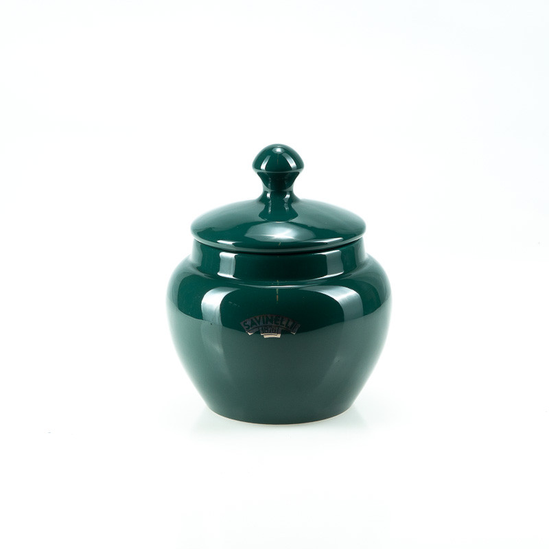 Vaso portatabacco bombato in ceramica verde con scritta Savinelli. Umidificatore incluso.